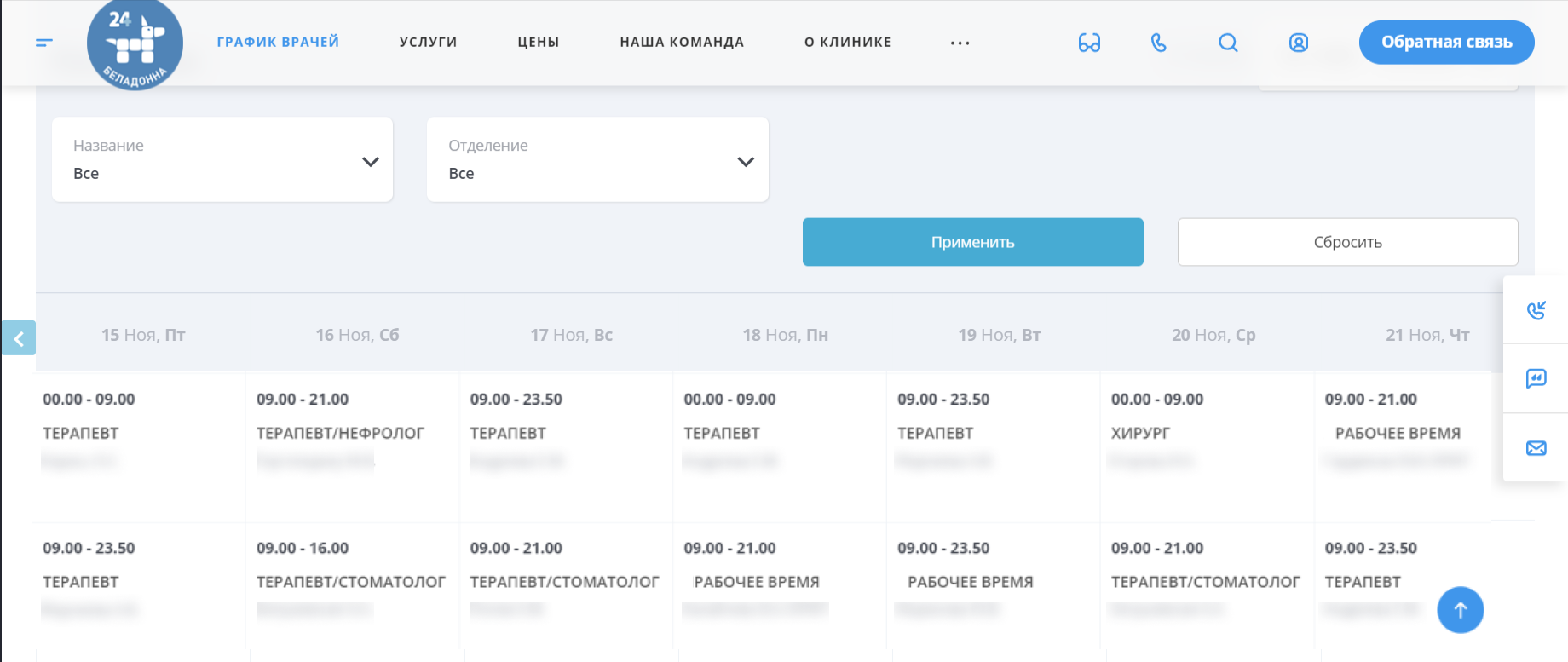 Пользователь на отдельной странице может ознакомиться с актуальным списком цен, который также соотносится с МИС на базе 1С, и оставить заявку на прием, которую регистратор заносит в систему и может связаться с клиентом. Забронированное время при этом станет недоступным для записи в календаре на сайте в соответствии с реальной загрузкой врача.