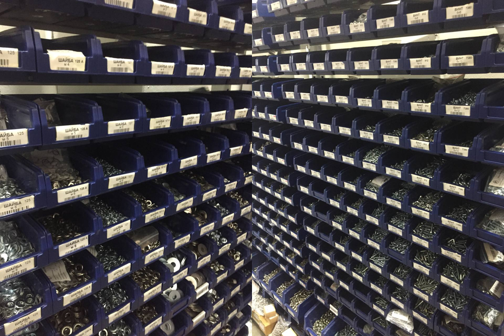 В ТЭТе очень большой объем номенклатуры — порядка 38 000 наименований. Материалы, комплектующие и готовая продукция хранится на складе на стеллажах в ячейках с уникальным штрих-кодом.