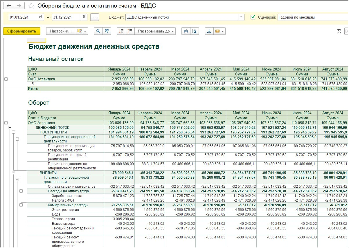Бюджет движения денежных средств (БДДС) показывает реальные денежные поступления и платежи по операционной, инвестиционной и финансовой деятельности. Этот бюджет является ключевым инструментом управления ликвидностью и предотвращения кассовых разрывов.