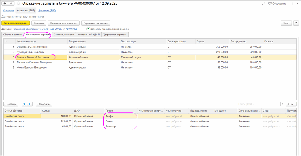 • Распределение зарплаты, НДФЛ и страховых взносов по управленческим аналитикам