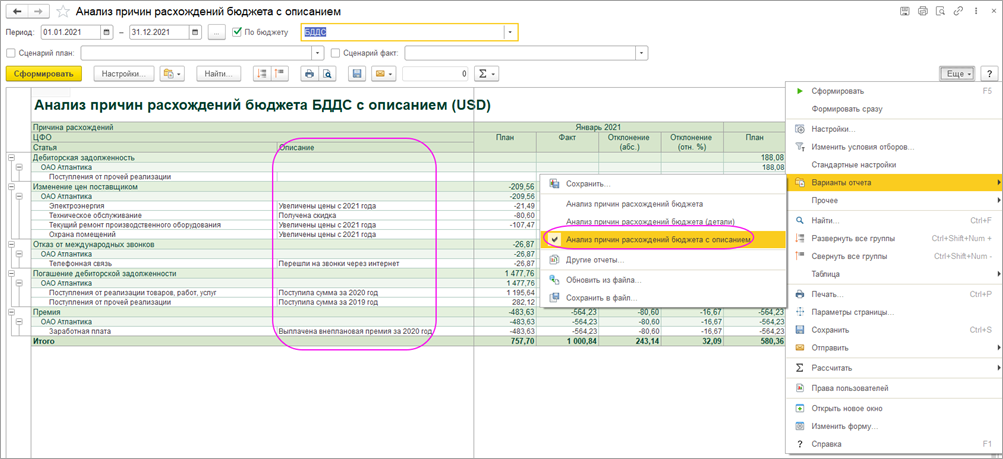 В отчете можно вывести текстовое описание по каждому отклонению, что особенно удобно для анализа ФОТ: например, можно указать, что перерасход связан с переработками, премиями или другими причинами. Такой подход обеспечивает прозрачность управленческого учета и помогает принимать обоснованные решения по оптимизации расходов на персонал.