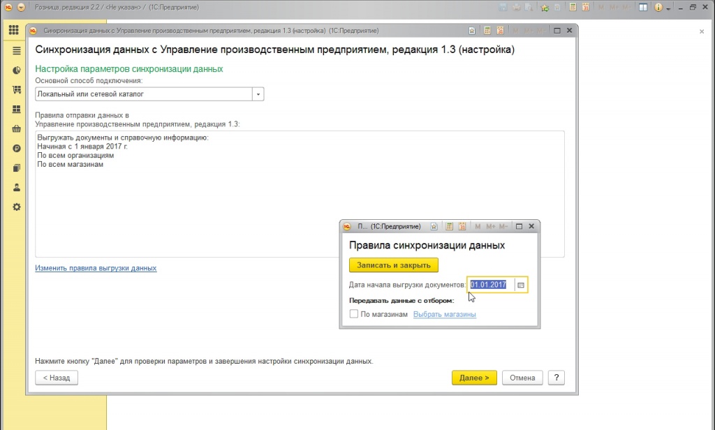Формируем файл для настройки синхронизации для «РОЗНИЦА» (в дальнейшем это позволит отказаться от повтора действий). Если выполнить отправку данных необходимо сразу после настройки обмена, в соответствующей строке ставим флажок.