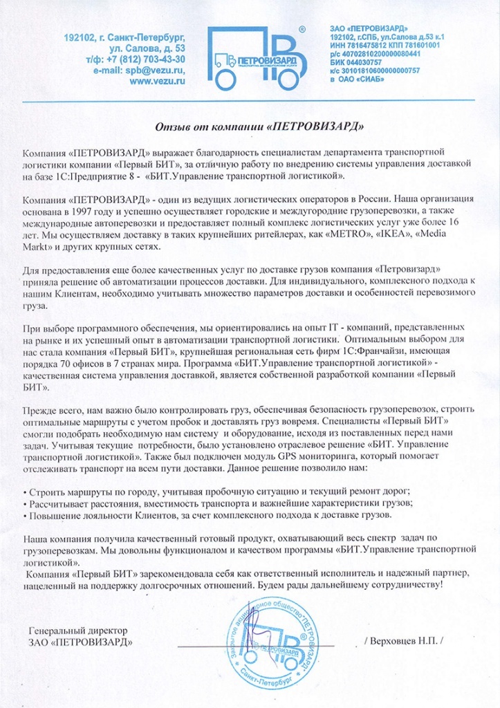 Для автоматизации управления доставкой в ЗАО «ПЕТРОВИЗАРД» был выбран программный продукт «БИТ.Управление транспортной логистикой».